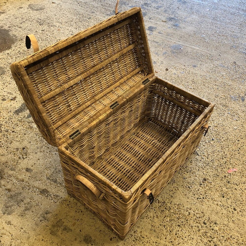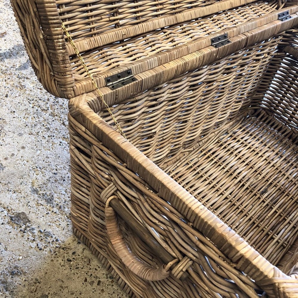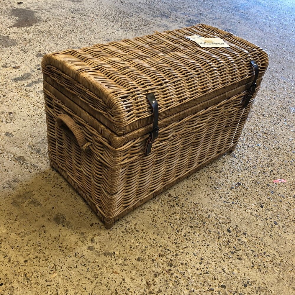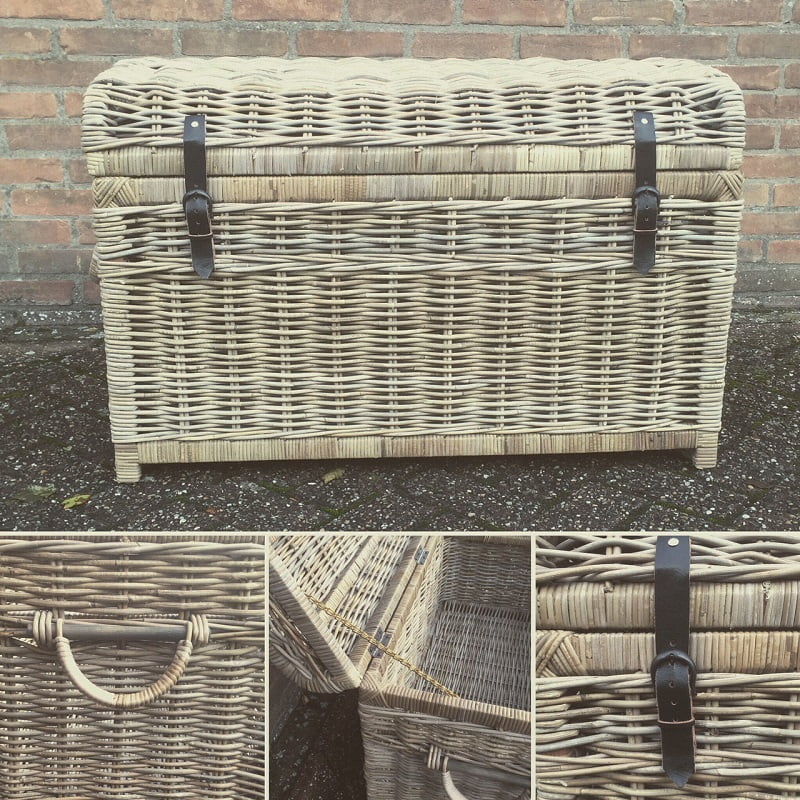 De rieten mand is voorzien van twee leren sluitingen, zeer gebruiksvriendelijk door de stevige scharnieren in het deksel en gemakkelijk verplaatsbaar door de handvaten aan de zijkant.