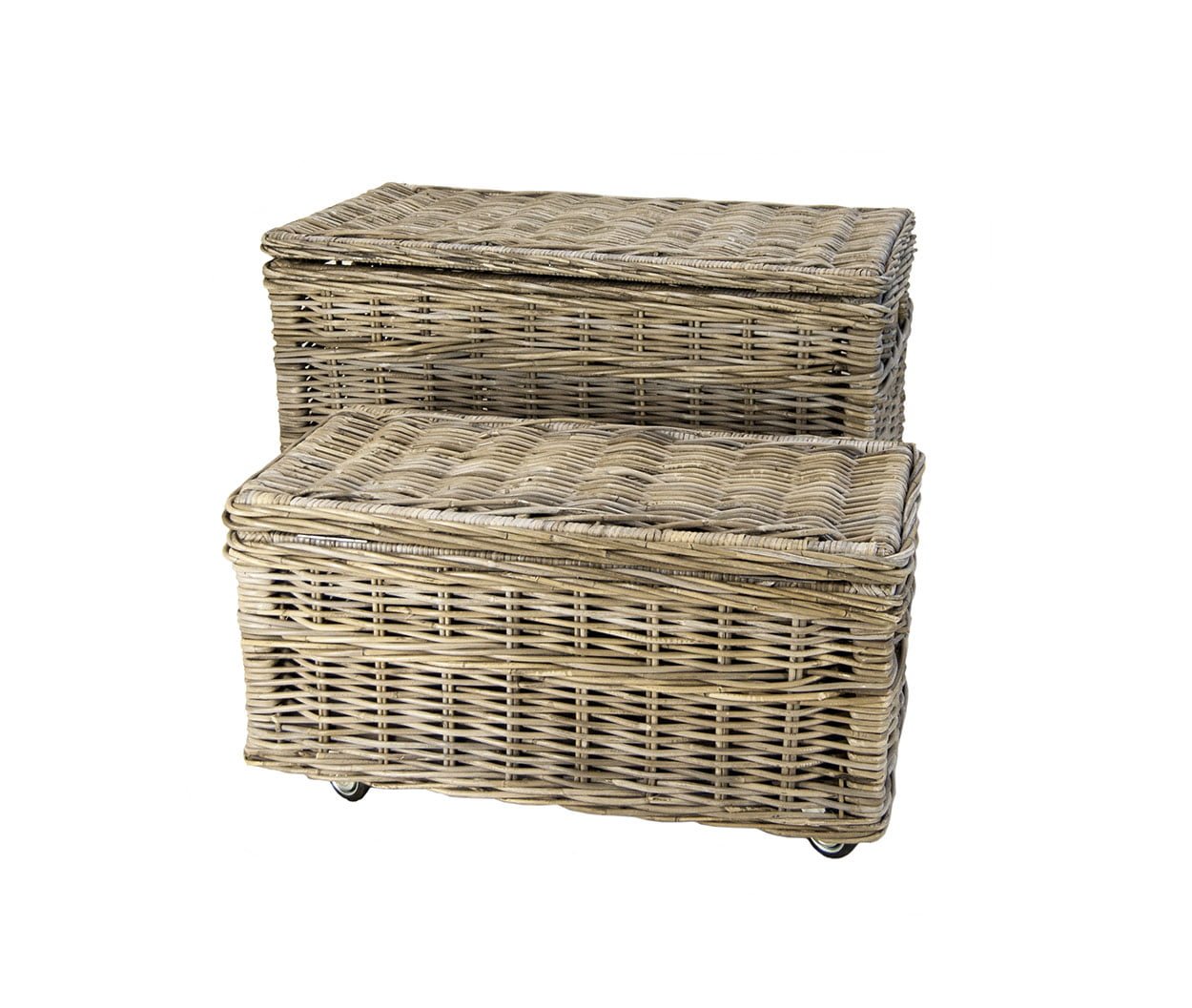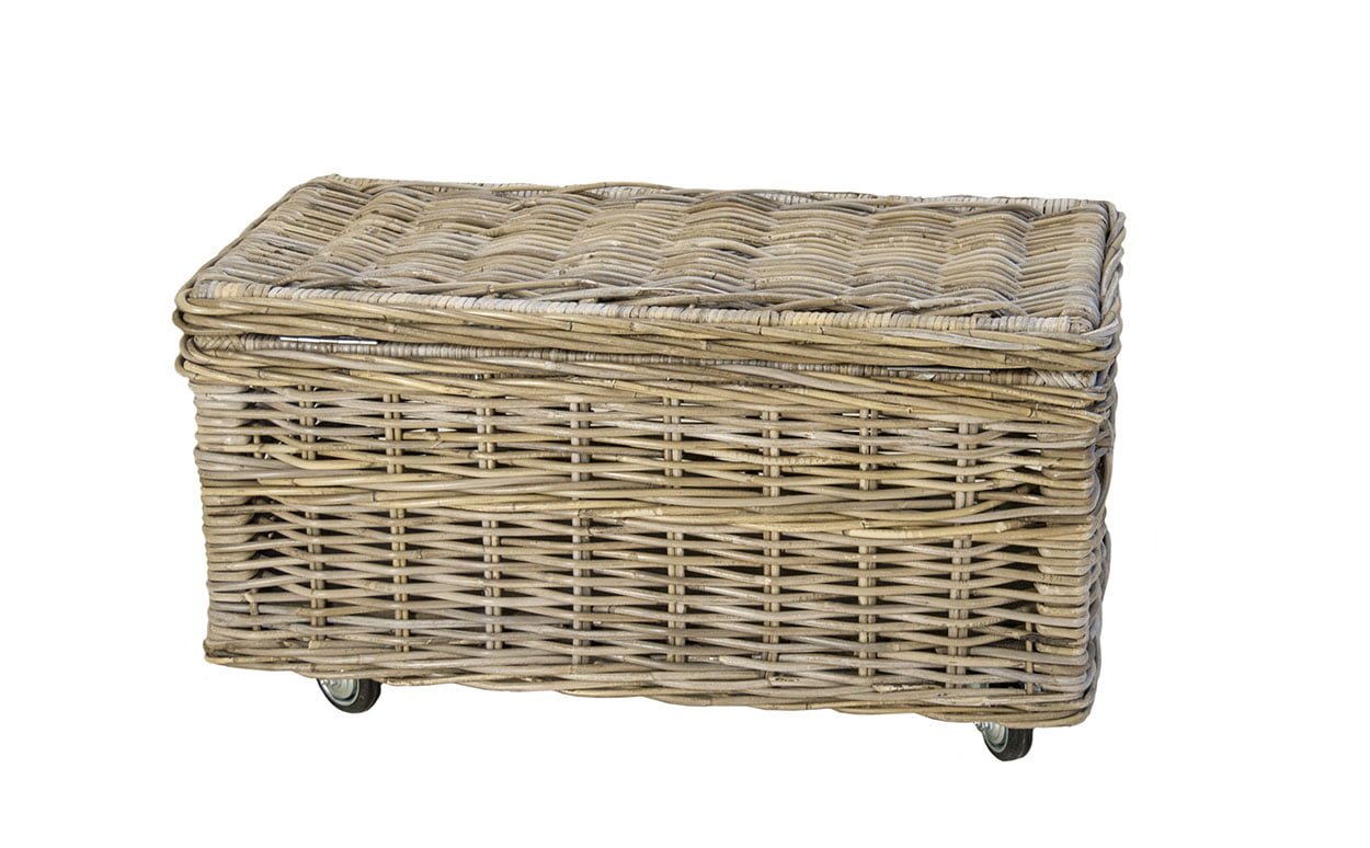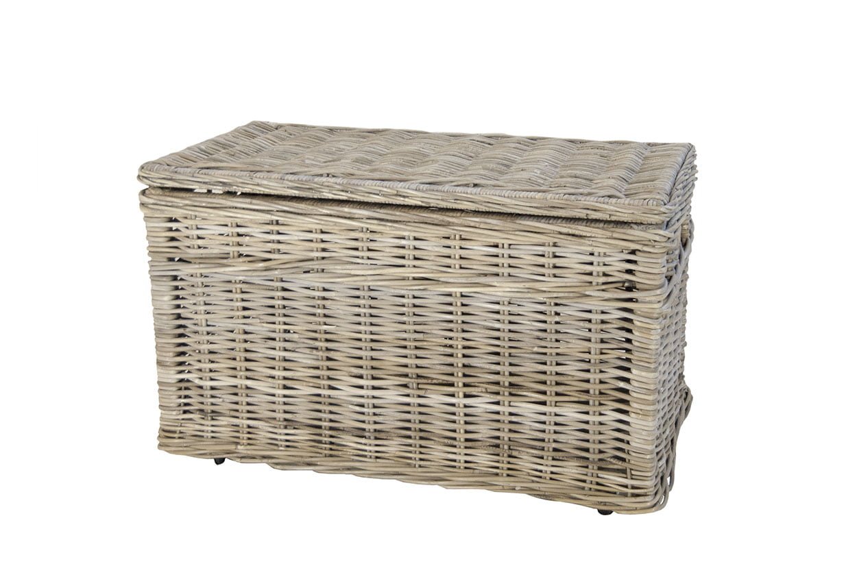 Robuuste rechthoekige rieten mand gemaakt van Grey rotan. Zeer gebruiksvriendelijk door de stevige scharnieren in het deksel en gemakkelijk verplaatsbaar door de wielen.
